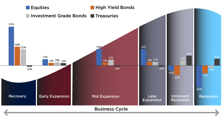 Source: Omega Squared proprietary research of the business cycle, 12/31/2018. Annualized monthly returns from January 1970 – December 2018. Returns are defined as follows: Equities – MSCI U.S. Total Return Index. High Yield Bonds – U.S. High Yield Bond Index. Investment Grade Bonds – Investment Grade Bond Index. Treasuries – 10-Year U.S. Treasuries.